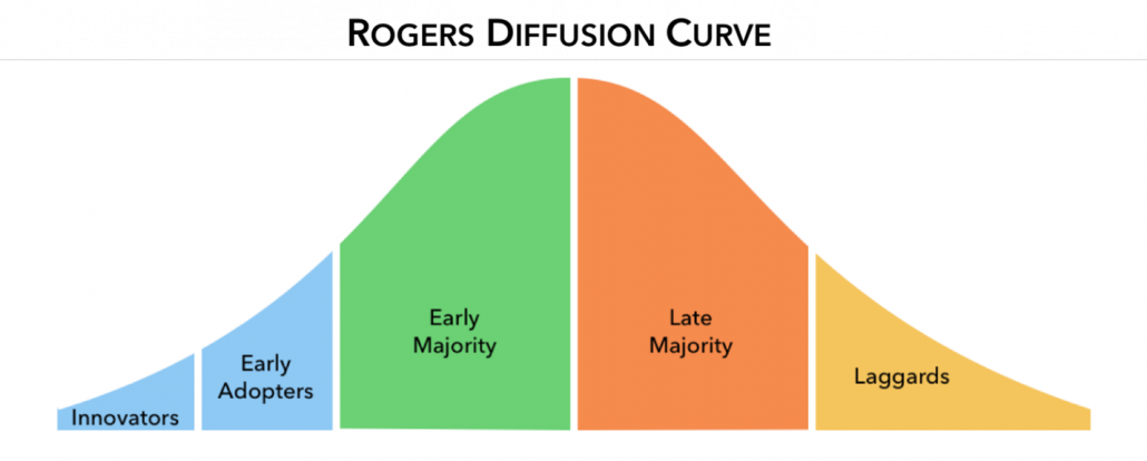 Perhaps worryingly, the ‘change averse’ and ‘late majority’ are said to make up nearly half of people, so evidently, we can’t wait around for them to get on board. However, it’s worth noting that they will take social cues from the ‘early adopters’/’innovators’ to get onboard (especially when praised by leadership and when leaders are part of the early adopters/innovators).
