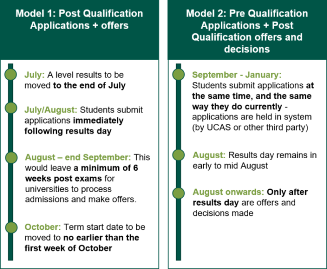 The DfE consultation put forward two PQA models for comment, which UCAS has since reflected on in their April ‘Reimagining UK Admissions’ report. The basis of the two models are shown below. UCAS’ recommendation essentially aligns with model 2, but also allows for multiple application points before results day. This enables students to change their mind regarding courses or institutions throughout Year 13, or to replace them following an unsuccessful interview.